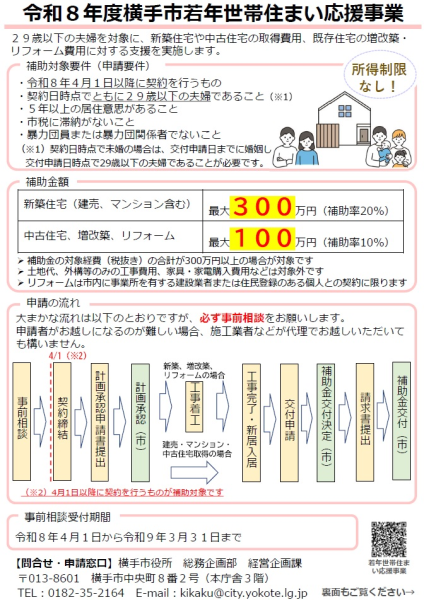 お知らせ 「令和8年度 横手市若年世帯住まい応援事業」 NEW