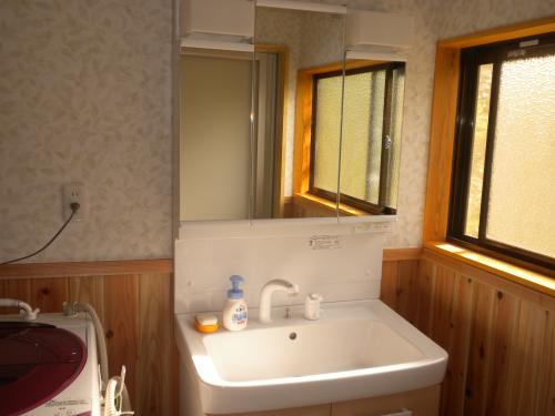 新しい洗面化粧台は三面鏡で収納も多く、シャワー付なので使うのが楽しくなります。