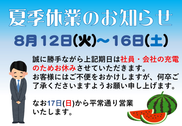 お客様にはご迷惑おおかけしますが下記日程で「夏季休暇」をいただきます。ご不便をおかけしますがよろしく...