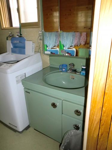 トイレ交換と同時にホーロー部分から錆が出始めた古くなった洗面化粧台をシャンプードレッサーに交換し、同時に壁紙と床材も張り替えました。