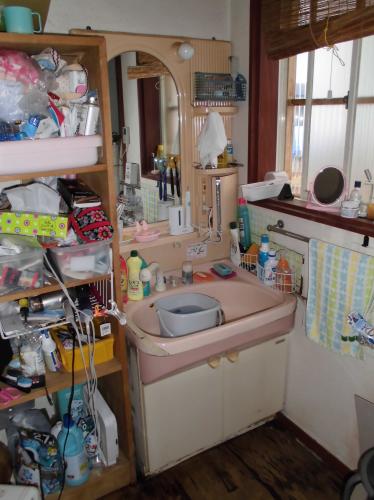 洗面化粧台の内部が水漏れで黒ずんで床の張替と共に交換することとした。