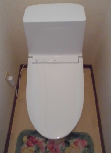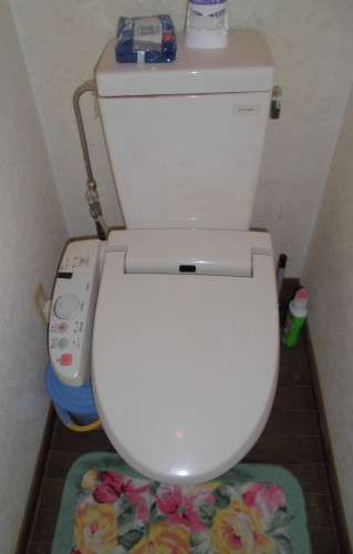 長く使ってきた水洗トイレだったが最近の節水型で自動洗浄機能のついた水洗トイレに交換することとした。同時に汚れていた床もリフォームすることとした。