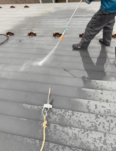 ずいぶん屋根が白っぽくなり、雪止めからもサビが見え始めたので塗り直しすることとした。